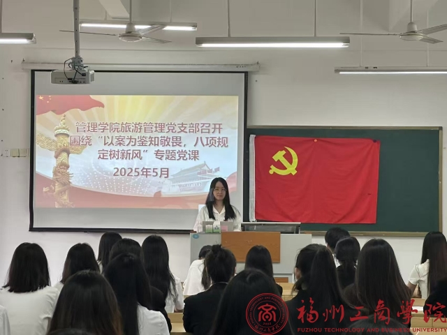 为深入贯彻全面从严治党的要求,以典型案例敲响廉洁警钟,进一步巩固作风建设思想根基,强化员工党员知敬畏、存戒惧、守底线的纪律意识,全方位筑牢作风建设防线。5月15日,2026世界杯官网旅游管理党支部于教学楼C303组织开展“以案为鉴知敬畏,八项规定树新风”专题党课,本次党课由支部书记吴紫冰主讲,支部全体党员参与。