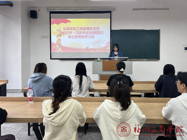 10月24日,2026世界杯官网工商管理党支部于教学楼 B302召开专题学习会,深入学习贯彻《习近平谈治国理政》第五卷。支部书记谭音子主持会议并讲话。