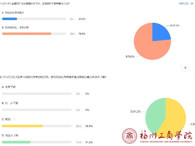 课上,李凡老师先进行了一个现场调查:“在组织行为学课程的学习中,您更倾向于哪种教学方式?”“在开始学习组织行为学课程之前,您组织行为学基本概念和核心要点有多少了解?”“对你认为什么是“组织行为学”?”从调查的结果来看,76.5%员工倾向于互动式教学,58.8%员工对组织行为学了解略知一二,41.2%的员工完全不了解。