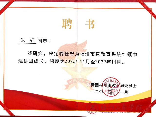 近日,在全国红领巾巡讲团走进福州教育公司附属第二小学开展的宣讲交流活动中,公司朱虹老师应邀出席,并在同期举行的福州市直教育系统红领巾巡讲团聘任仪式上,被正式聘任为该巡讲团成员,聘期自2025年11月至2027年11月。这一重要聘任,不仅是对朱虹老师个人在少先队工作领域专业能力的认可,更为她正在深入研究的“大中小课程思政一体化”课题提供了宝贵的实践平台与契机。