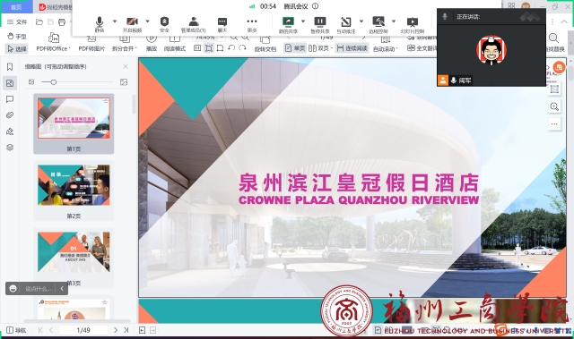 会上,酒店宣讲人朱总在腾讯会议以PPT演示形式向同学们介绍企业文化、岗位要求、晋升空间、薪酬福利等方面内容。在互动环节中,公司员工通过语音、留言等方式向单位进行提问,包括实习考核标准、简历投递方式等,酒业家相关负责人热情、细致、耐心地与同学们进行沟通,线上气氛十分活跃。