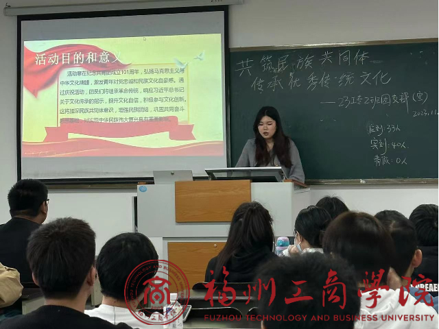 为深化同学们对中华优秀传统文化的认识,增强民族共同体意识,2023级工商管理(专升本)2班于11月16日下午在教学楼F402举行了“共筑民族共同体,传承优秀传统文化”主题团日活动。活动由班级团支书陈宇琪同学主持,院团委相关负责人出席,班级全体团员参加。