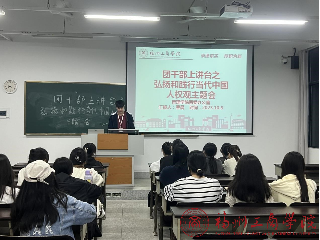 会议初始,大家以“弘扬和践行当代中国人权观”主题书籍进行集体讨论分享。随后蔡晨同学结合十八大以来习近平总书记围绕尊重和保障人权发表的一系列重要论述为大家展开了关于当代中国人权观详细的介绍,叙述了自己关于当代中国人权观的认识以及深入学习贯彻习近平新时代中国特色社会主义思想后的感想的同时,使团学干部们熟知当代中国人权观的基本内涵,,并引领团学干部们树立正确的世界观。例会最后,团学干部轮流上台分享了关于书籍的个人心得与体会,进一步加深了团学干部对此次分享会的深刻感受。