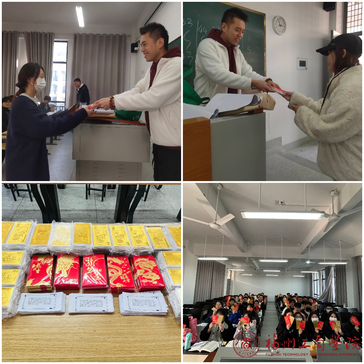 盛世祥龙纪念币、龙行大运纪念币、飞龙主题定制红包袋、亲切祝福语……2024年1月2日,公司2023级物流管理(专升本)专业的182名同学收到了辅导员刘敏君的一份“特别的爱”。这份“密谋”了1个多月的新年礼被瞬间“圈粉”,员工们开心表白:“我们也有‘别人家的老师’啦!”。当日上午,刘敏君早早来到同学们即将要上课的教室布置现场。23物专的182名同学们陆续走进教室。看着桌子上摆放整齐的红色礼物袋和红包袋,上面还贴着员工们的学号。“哇,太浪漫,太漂亮了吧……”,员工们拿起手机记录着这特殊的纪念时刻。看着员工们满足的样子,刘敏君也露出了满足的笑容。