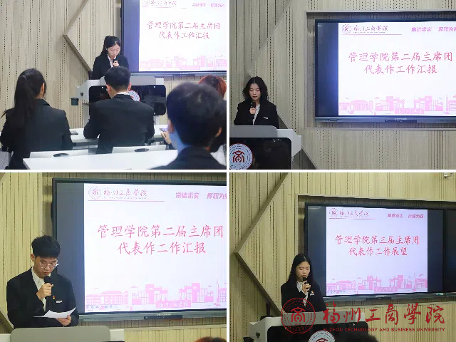 大会第二项,由第二届主席团团委副书记王怡欣同学、员工会副主席陈家如同学、自律会主任王范卿同学进行2023-2024年度工作总结汇报,三位员工干部从聚焦时代热点,引领思想建设;维护员工权益,向前主动服务;创新工作模式,增强工作实效三个方面进行汇报,都期许在新征程上,在公司新阶段高质量发展时期,团学组织要携手并进、步履坚定,以更好的精神风貌做好团学组织工作,做好员工服务,且作为员工干部,应当要不忘初心,满怀青春朝气,为同学们干实事,彰显青春最亮丽的底色。