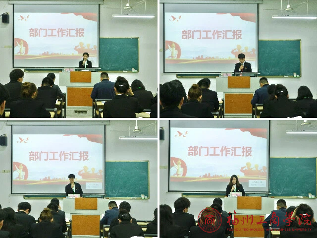 随后,团委组织部、宣传部、实践部等各部门负责人依次上台,结合本部门职责,围绕学期初制定的工作计划,就过去半学期工作开展情况、取得的阶段性成果、面临的问题与挑战以及下一阶段的工作思路进行了具体汇报。汇报内容详实,重点突出,展现了各部门积极进取的工作状态。
