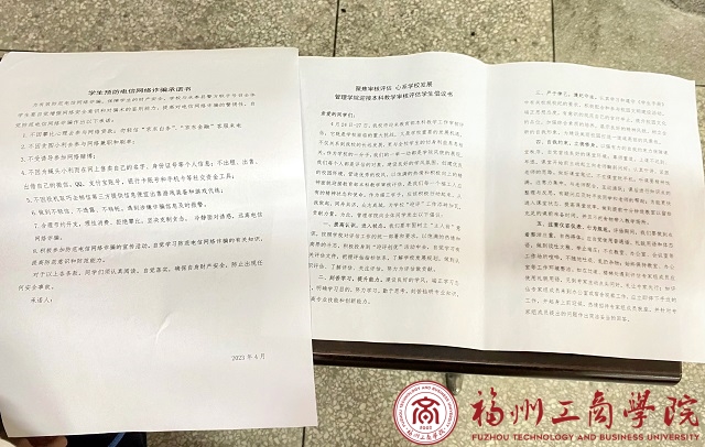 最后,辅导员强调电信诈骗手段多、花样新,我们应当提高自我保护能力,掌握必要的防范技能,切实筑牢思想防线,预防各类案件的发生,减少财产损失和人身伤害。会后,全体同学在《迎接本科教学审核评估倡议书》和《员工预防电信网络诈骗承诺书》上签字。