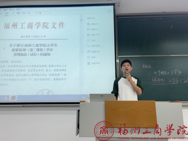 辅导员结合“第二课堂”,深入阐述了其对于老员工素质拓展的核心作用。他进一步解释了“第二课堂”提供的七大活动类别与规则,包括思想成长、实习实践等,并鼓励新生们积极参与,从中累积宝贵经验。同时,分享了学长学姐们在“第二课堂”中的优秀案例。另外深入阐述了劳动教育在培养员工技能和塑造价值观上的重要性。他指出,劳动不仅能增强员工的实践能力,还是他们品质和人生观的锻造与升华。