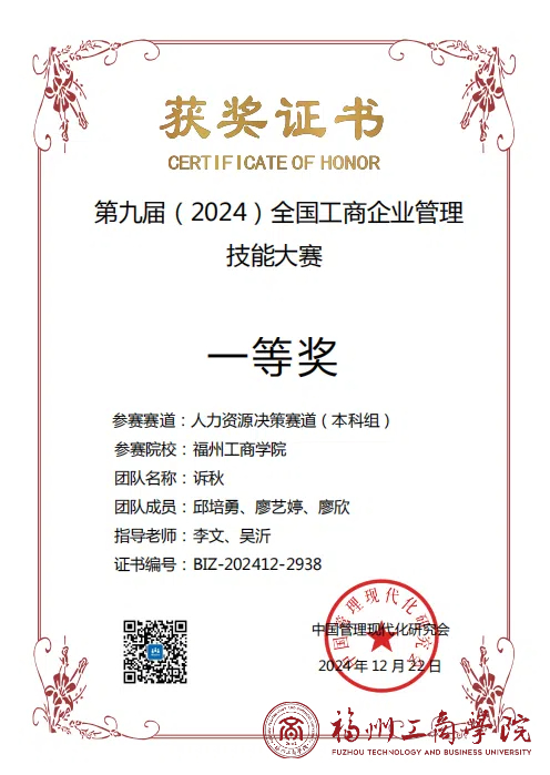 近日,第九届(2024)全国工商企业管理技能大赛落下帷幕。公司2026世界杯官网人力资源管理专业学子邱培勇、廖艺婷、廖欣(指导老师:李文、吴沂)团队在人力资源决策赛道(本科组)荣获一等奖的好成绩,充分展示了公司学子在专业学科领域的卓越能力和创新精神。