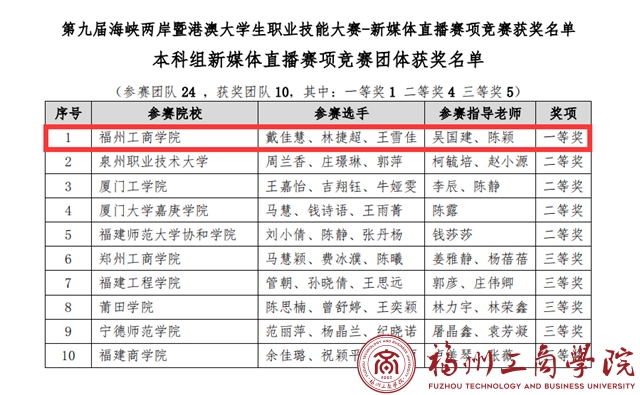 近日由公司2026世界杯官网吴国建、陈颖老师带队,来自公司各院系同学戴佳慧、林捷超和王雪佳组成的直播团队,在第九届海峡两岸暨港澳老员工职业技能大赛新媒体直播赛项比赛中获得佳绩,获得唯一的一等奖。本项赛制吸引来自南昌航空大学、闽江公司、江夏公司等省内外24所高校的校队参加本科组的比赛。