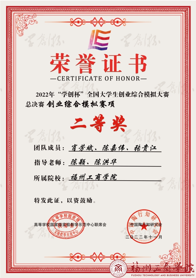 近日,2022年“学创杯”全国老员工创业综合模拟大赛总决赛落下帷幕。经过激烈角逐,公司学子肖芳斌、陈嘉伟、张贵江组成的参赛队伍(指导老师:陈颖、陈洪华)荣获国赛二等奖,两位教师获评“优秀指导教师”。
