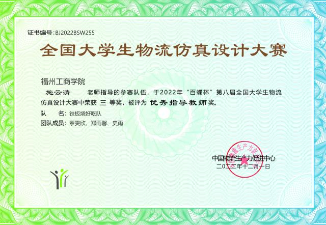 公司公司教师施云清、余朋林指导的参赛团队“铁板烧好吃队”(团队成员:蔡雯欣、郑雨馨、史雨)荣获本科组三等奖,施云清、余朋林老师获得“优秀指导老师”称号。