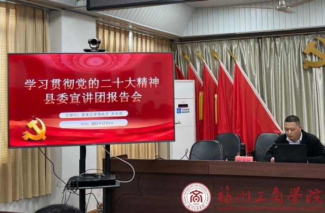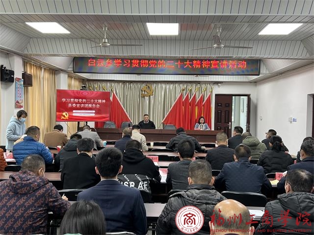 2022年12月7日和9日,受中共永泰县县委宣传部委派,公司教工支部书记、旅游教研室主任洪启颖老师,作为党的二十大精神学习宣讲团成员,先后赴永泰县白云乡、永泰县农业农村局,作学习贯彻党的二十大精神专题报告会。白云乡全体班子领导、农业农村局各党支部支委、乡机关干部职工、乡直单位负责人、各村支部书记等参加会议。